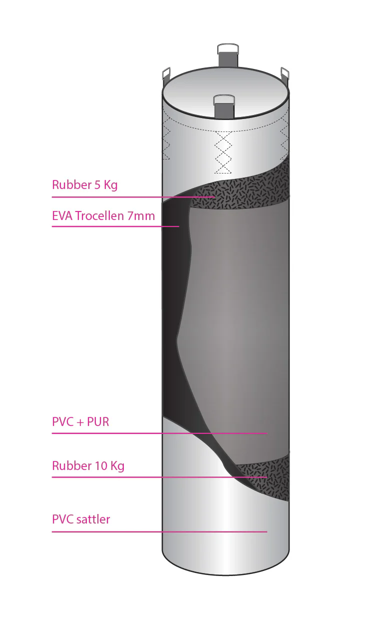It is filled with fabric core and PUR foam. There is a softened layer of EVA foam around the entire bag, which ensures the regularity of the surface. It also serves as an impact layer that absorbs impact. The diameter of this bag is 36 cm. We produce it in 2 sizes (150cm and 180cm) and several color variations.