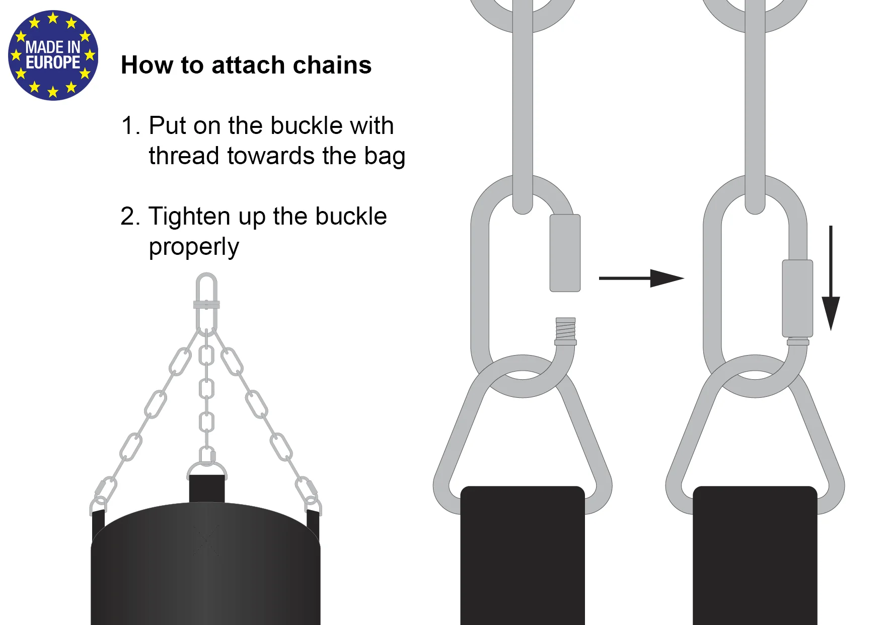 The boxing bag has an attachment on the bottom, which can be used to tie the bag to a solid hook or a weight. Once attached, the bag will return to you after every punch or kick, and the feeling of training will completely change.