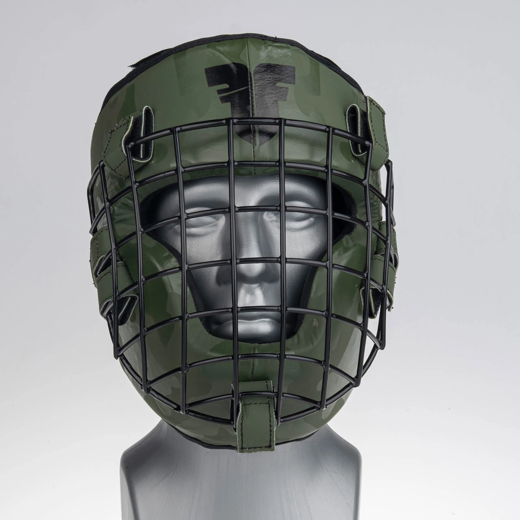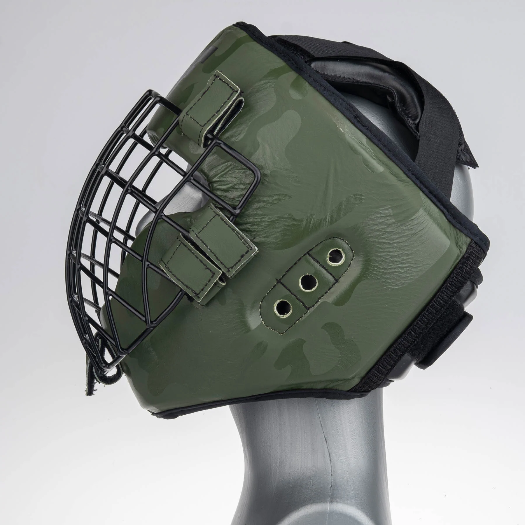 - Fighter leather head guard with removable metal grid