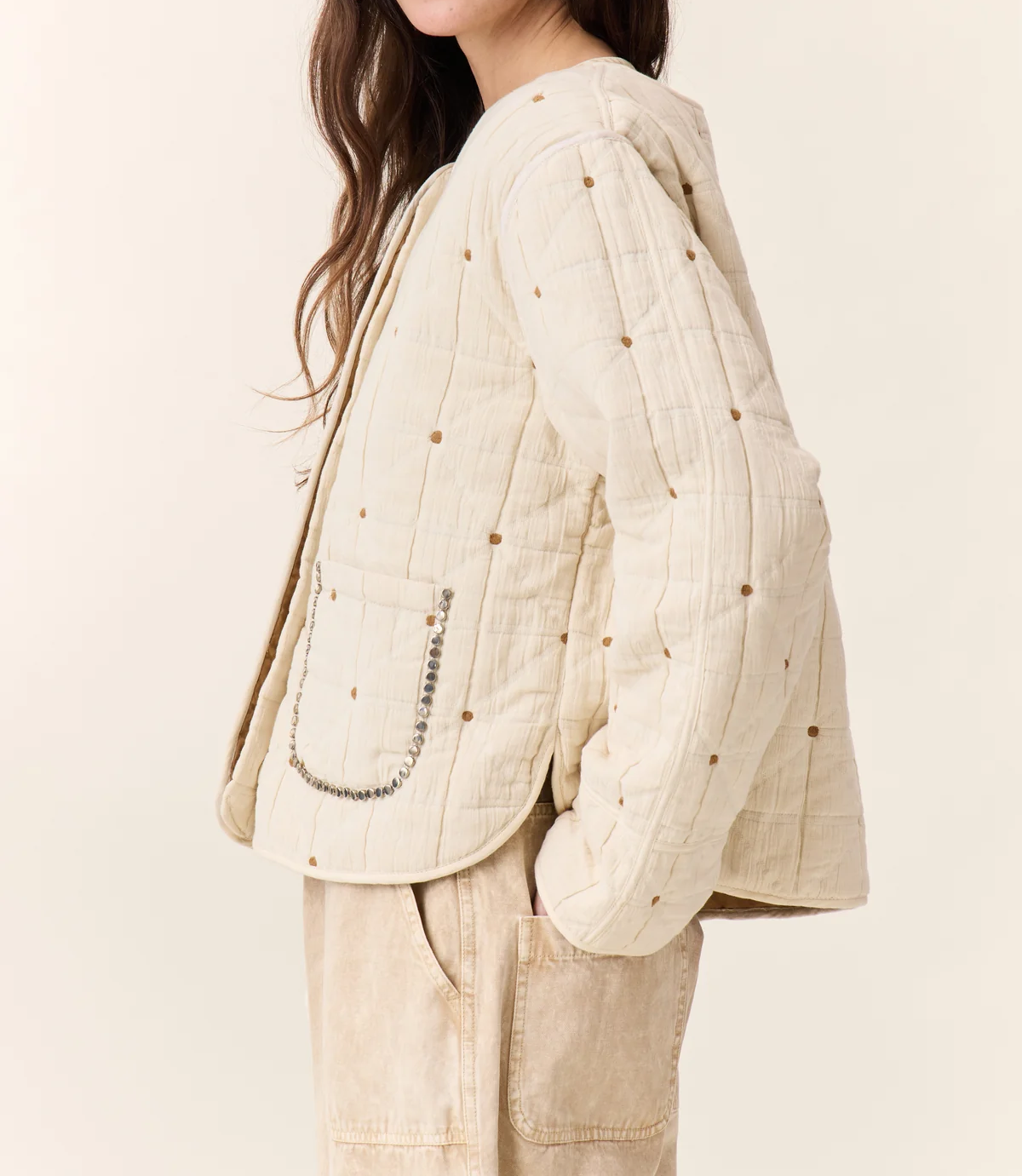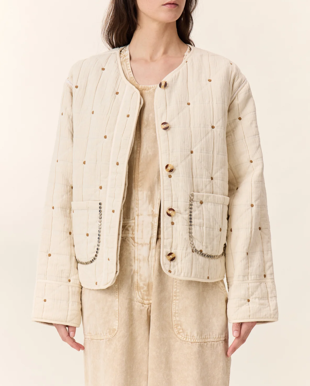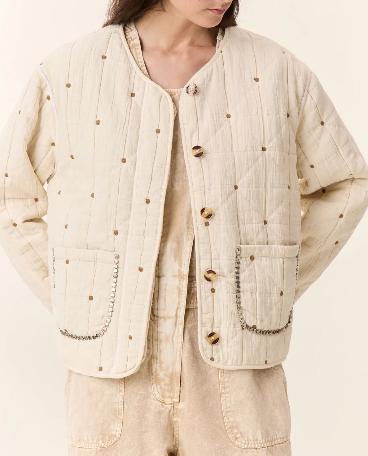 Veste Vahla Quilt Ecru  Composition : 100 % Coton L’allure bohème rencontre l’esprit workwear avec la veste Vahala Quilt matelassée. Son tissu texturé, relevé de petits pois brodés ocres et de surpiqûres géométriques, apporte une touche sophistiquée et cosy. Les poches plaquées, bordées de perles métalliques, donnent du caractère à cette pièce à la fois […]