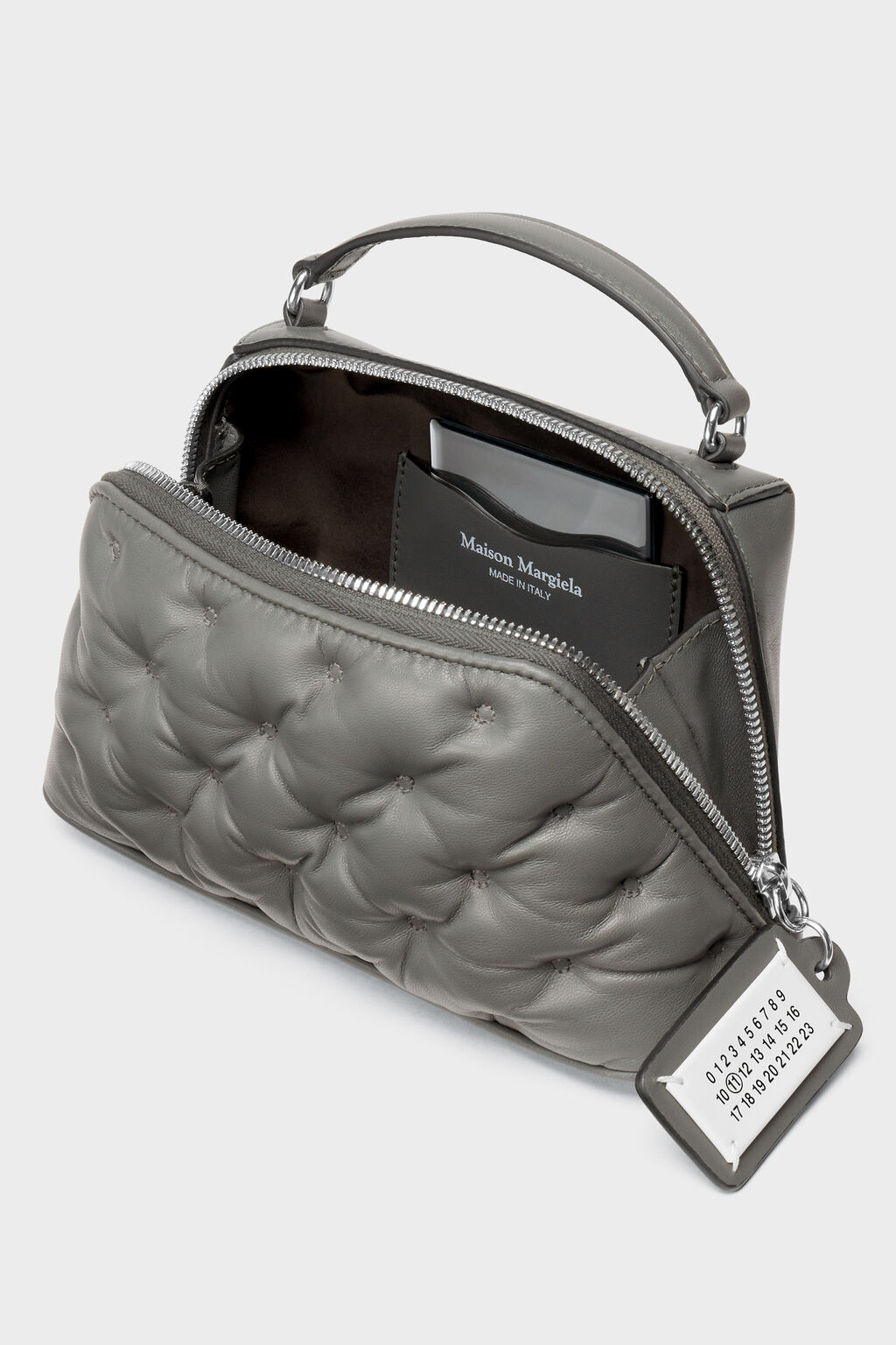 Ce sac trapèze Glam Slam est confectionné en cuir nappa brodé. Le Glam Slam a fait ses débuts lors du défilé SS18 et présente un design matelassé qui imite l’art du boutis – la broderie au piqué des courtepointes créées et cousues à la main à Marseille. Le concept reflète la notion de glamour inconscient de la Maison et évoque son association au confort, à la suite de l’étude sur les rituels d’habillage et de voyage dans le monde. Ce modèle est doté d’une anse supérieure, d’une bandoulière en chaîne amovible et arbore l’étiquette numeric logo sur la tirette de la fermeture éclair.