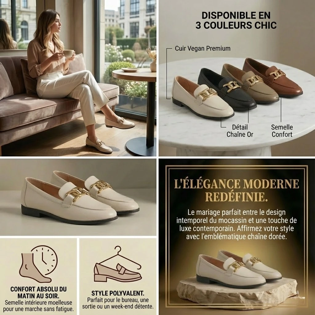 Sublimez votre allure avec le mocassin femme à chaîne dorée : l’équilibre parfait entre chic britannique et confort absolu.