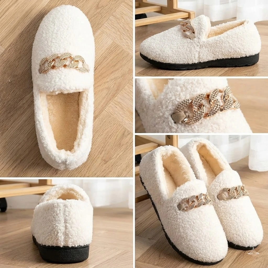 Disponible en blanc crème élégant et en noir intemporel, ce mocassin reprend les codes du confort hivernal tout en ajoutant une touche raffinée grâce à sa chaîne décorative tendance. Résultat : un modèle chic, doux et parfaitement adapté à celles qui recherchent une alternative haut de gamme au chausson classique.
