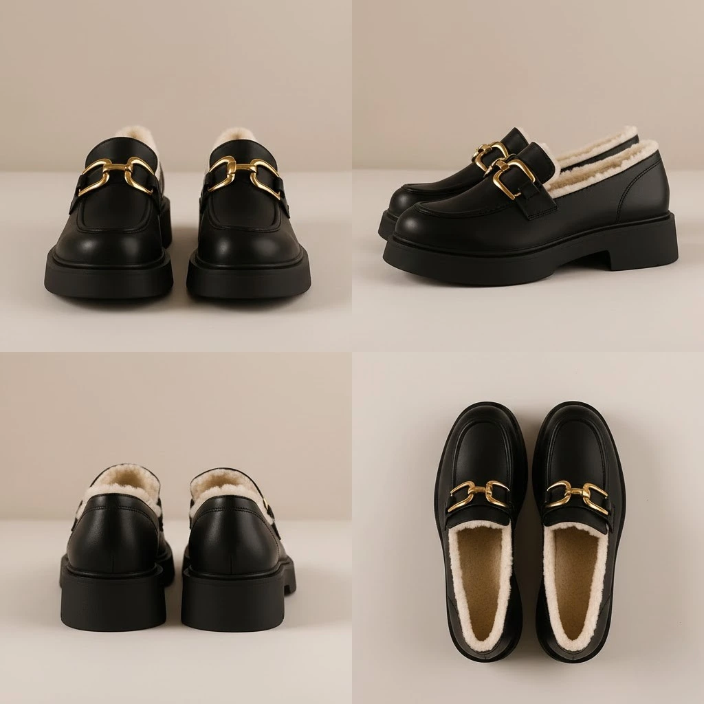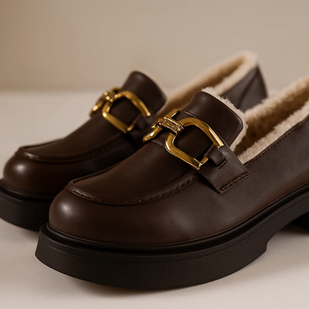 Adoptez ce mocassin femme fourré à semelle épaisse, spécialement conçu pour celles qui souhaitent rester chics, au chaud et parfaitement stables, même pendant les journées les plus froides. Ce modèle revisite le style rétro avec une boucle métallique dorée, une tige en cuir et une doublure en peluche courte ultra douce, idéale pour un hiver cocooning tout en élégance.