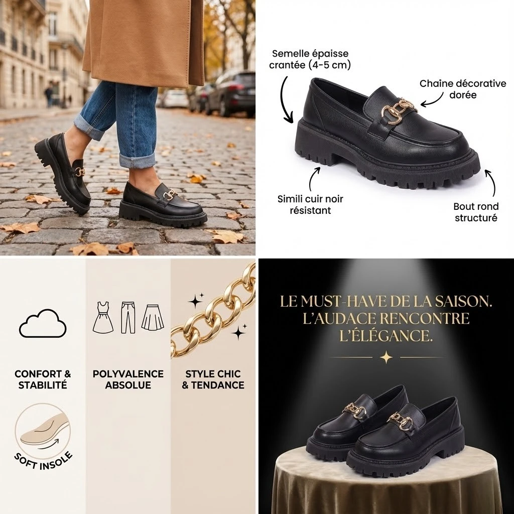 Parce qu’ils offrent le meilleur compromis entre élégance et confort. Leur chaîne dorée iconique leur confère une allure chic sans en faire trop, tandis que la semelle crantée apporte une touche contemporaine et un maintien irréprochable. Que vous soyez au travail, en rendez-vous ou en week-end, ces chaussures deviennent rapidement un indispensable de votre garde-robe.