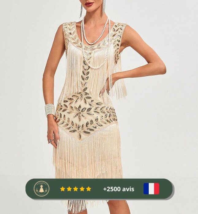 Démarquez-vous lors de votre prochain événement en arborant notre robe de soirée Gatsby années 20 beige. Cet habit exceptionnel vous plonge directement dans l’opulence et le faste qui caractérisaient cette époque de démesure. Elle est l’incarnation parfaite du charme et de la splendeur des années folles.