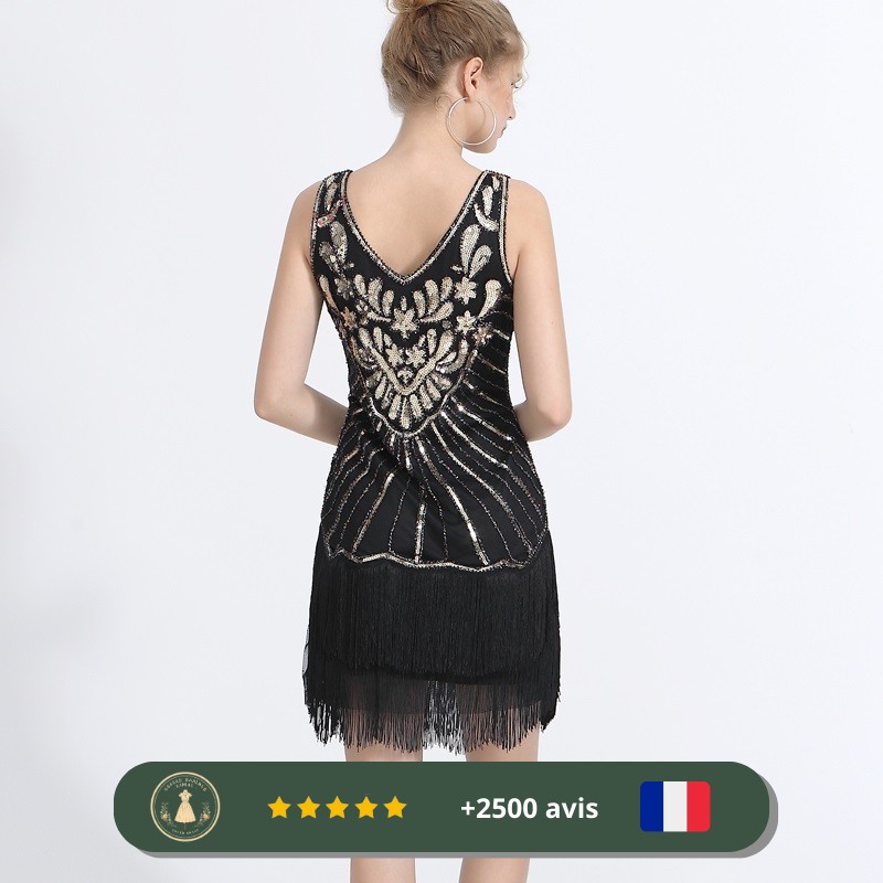 Ne manquez pas de compléter votre tenue avec des bijoux éclatants et une coiffure inspirée des années 20 pour une immersion totale dans l’ère du Charleston.