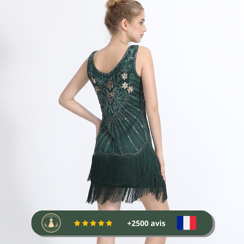 Entre ses franges dynamiques et ses détails brillants, ce vêtement incarne le faste et l’opulence pour une présence inoubliable. La couleur verte éclatante confère à cette robe une allure vintage irrésistible, parfaite pour être la star des soirées cocktail, des fêtes somptueuses ou des mariages élégants.