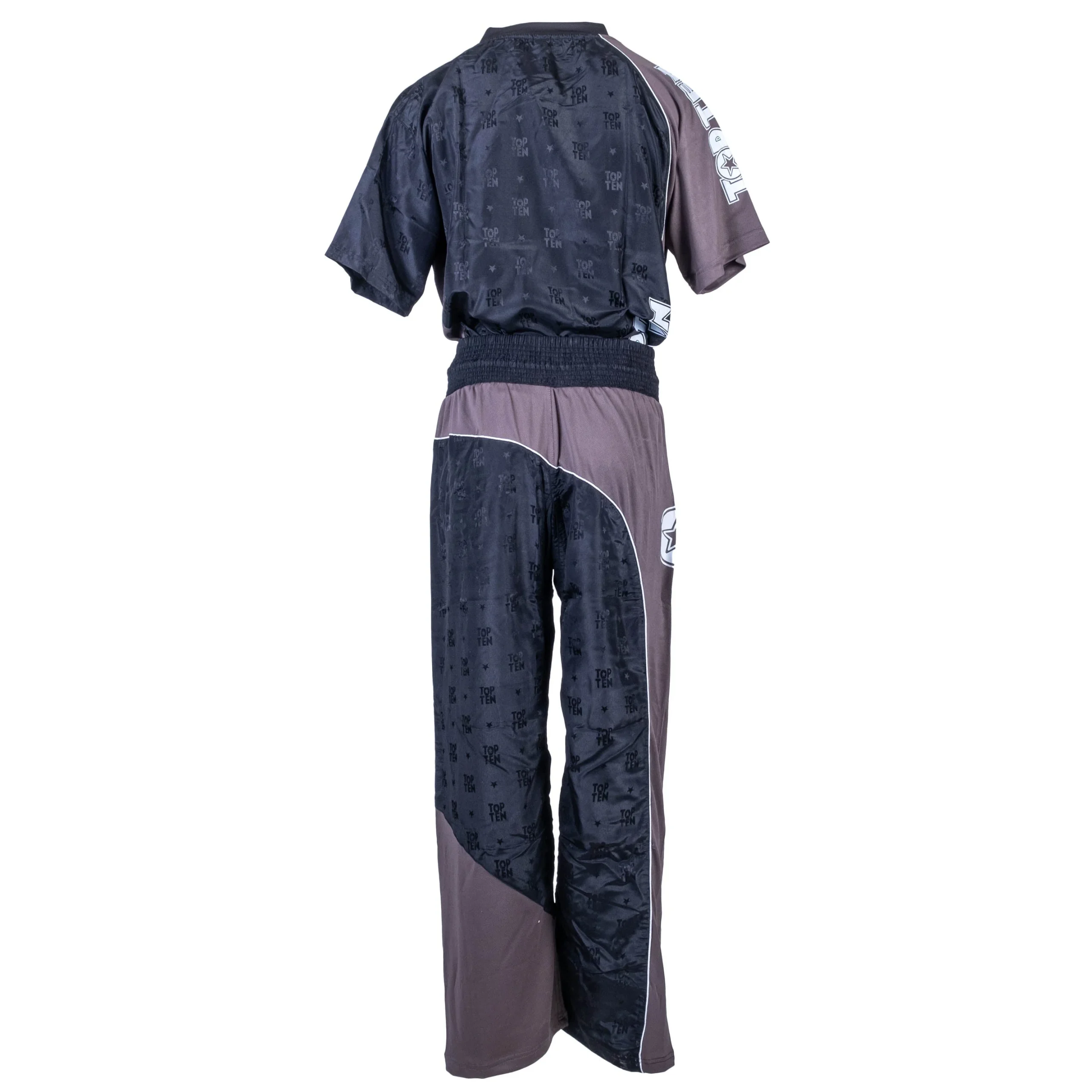 TOP TEN’s « Bow » kickboxing uniform is made entirely of ultra-lightweight synthetic fiber and is sporty and relaxed. Consisting of long pants and a short t-shirt.